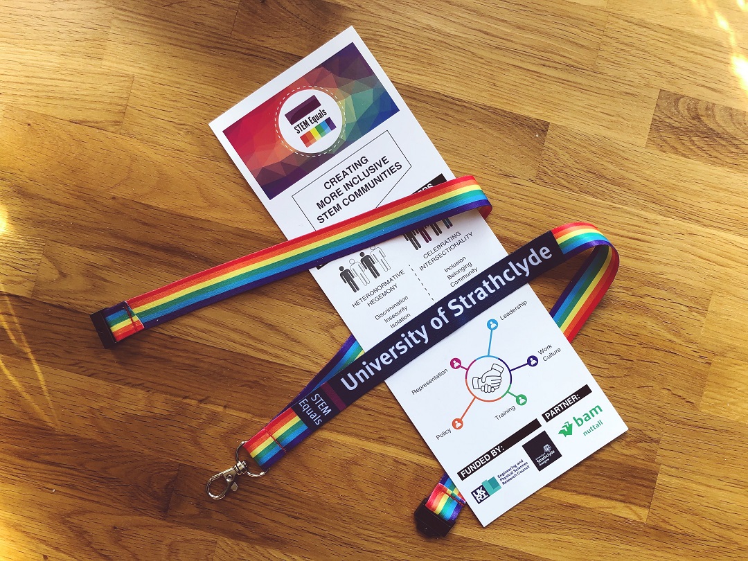 STEM Equals researcher Dr Marco Reggiani designed rainbow lanyards. The small batch of lanyards will be available to the first members of StrathPride (Please note: Ally members will need to have completed LGBT+ diversity training at Strathclyde or elsewhere before receiving a lanyard. Additional training opportunities will be organised at Strathclyde).